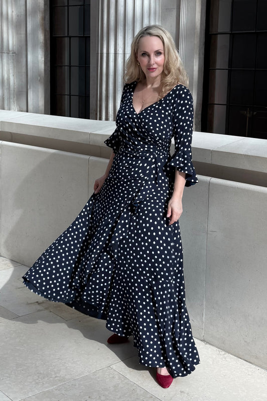 NEW IN - 'Stevie' Luxe Ruffle Dress in Navy Polka Dot
