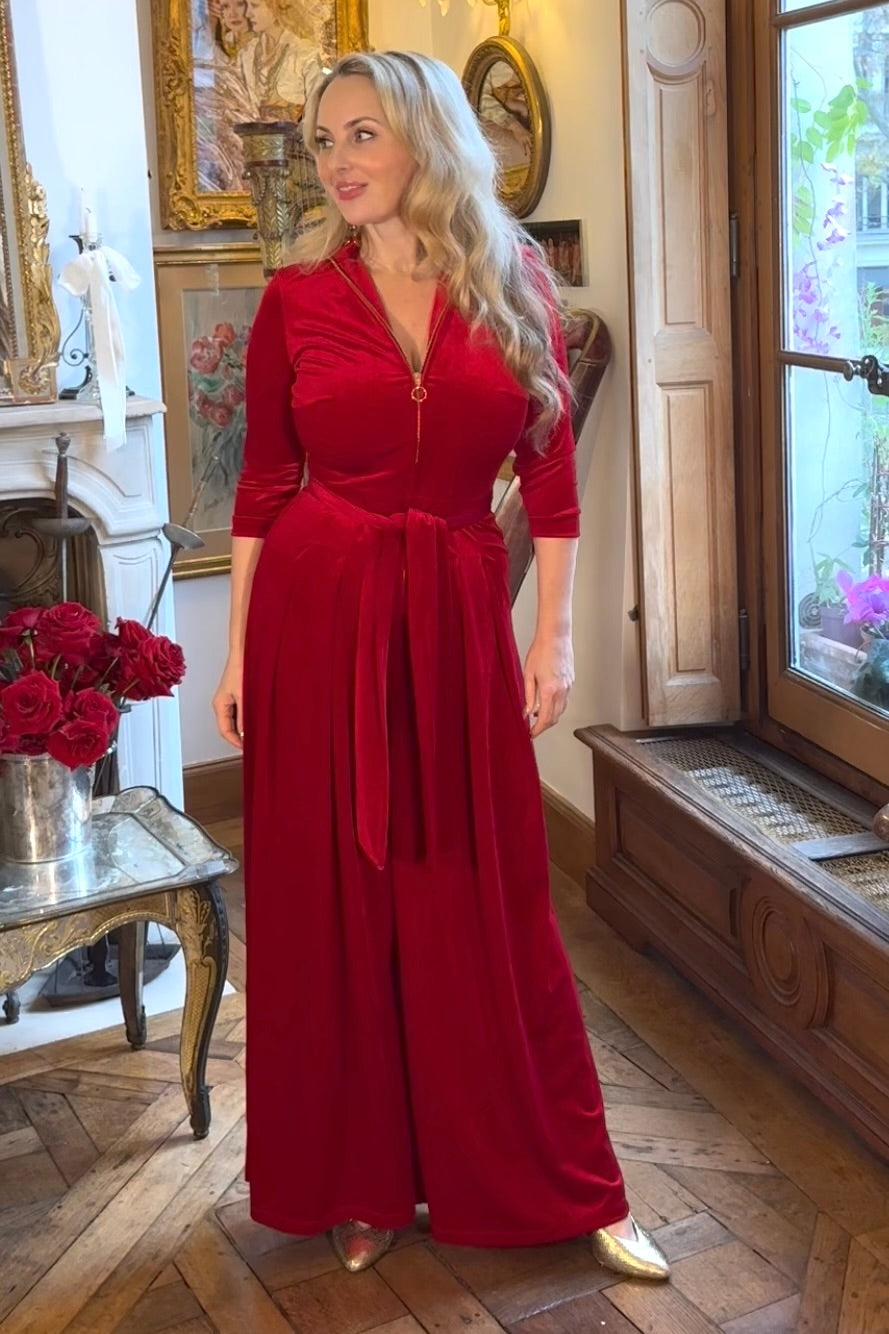'Hampstead' Velvet Luxe Zip Jumpsuit in Bright Red