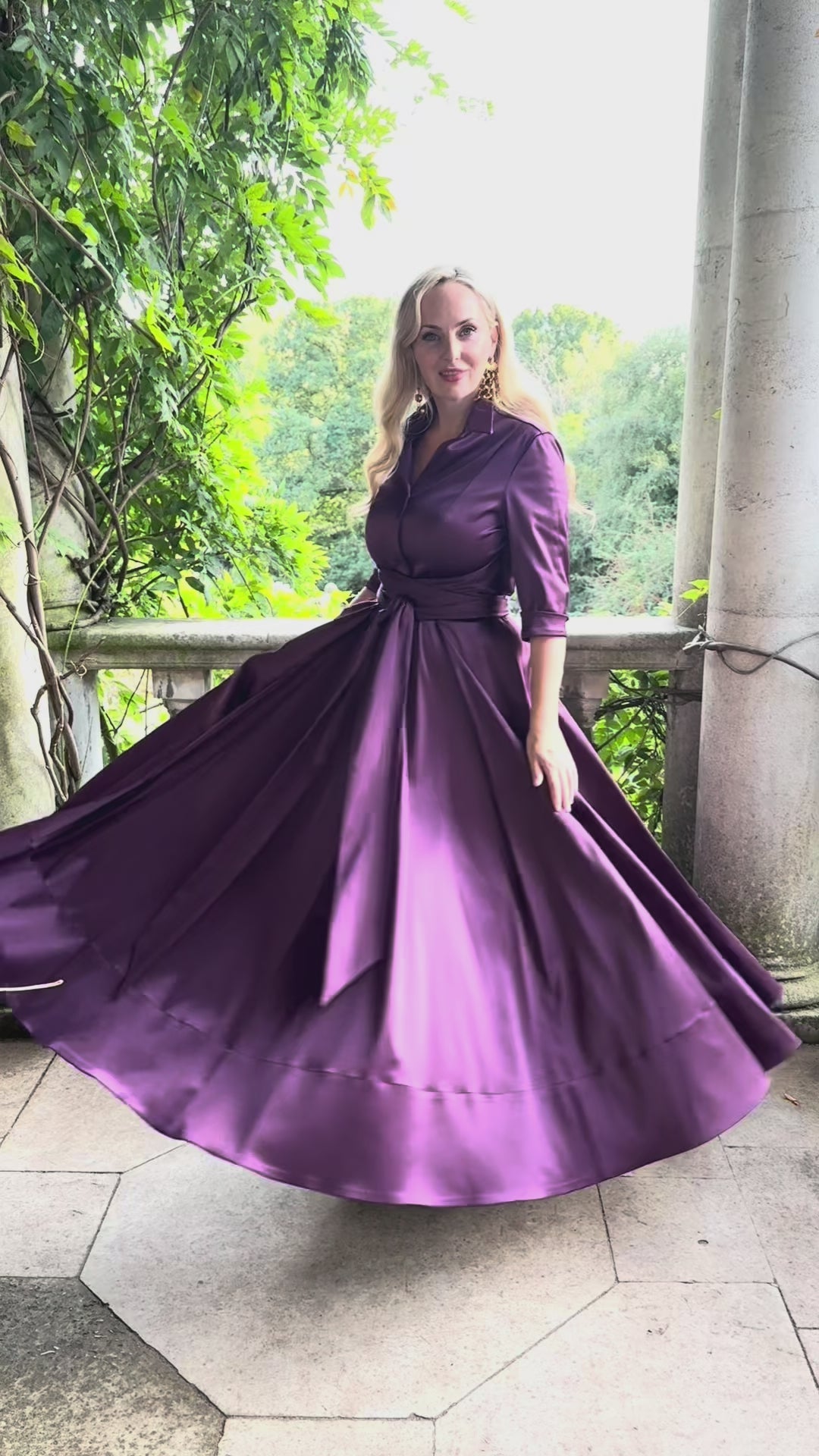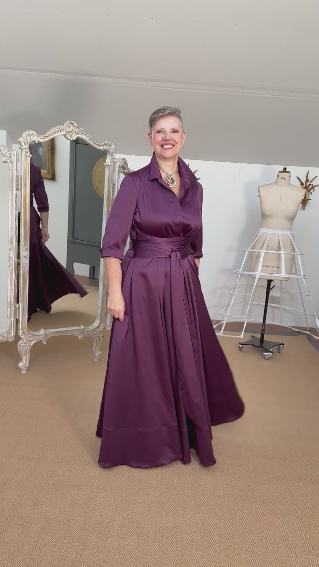 Introducing the Katya Wildman 'Signature' Maxi shirt dress - a stunning blend of structure and sophistication, crafted to really flatter your curves. This dress, in a lux plum stretch satin, combines the timeless appeal of a classic shirt dress with the glamour of a full on diva gown, thus creating the perfect choice for special occasions such as weddings, galas, or upscale events.